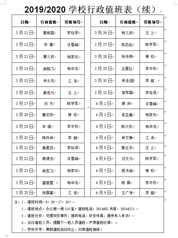 鉴于开学推迟和疫情防控工作需要,根据学校的实际情况,现将下一阶段(3月11日--4月9日)学校行政值班工作安排如下(见附表),请各位领导和值班同志认真遵照执行。