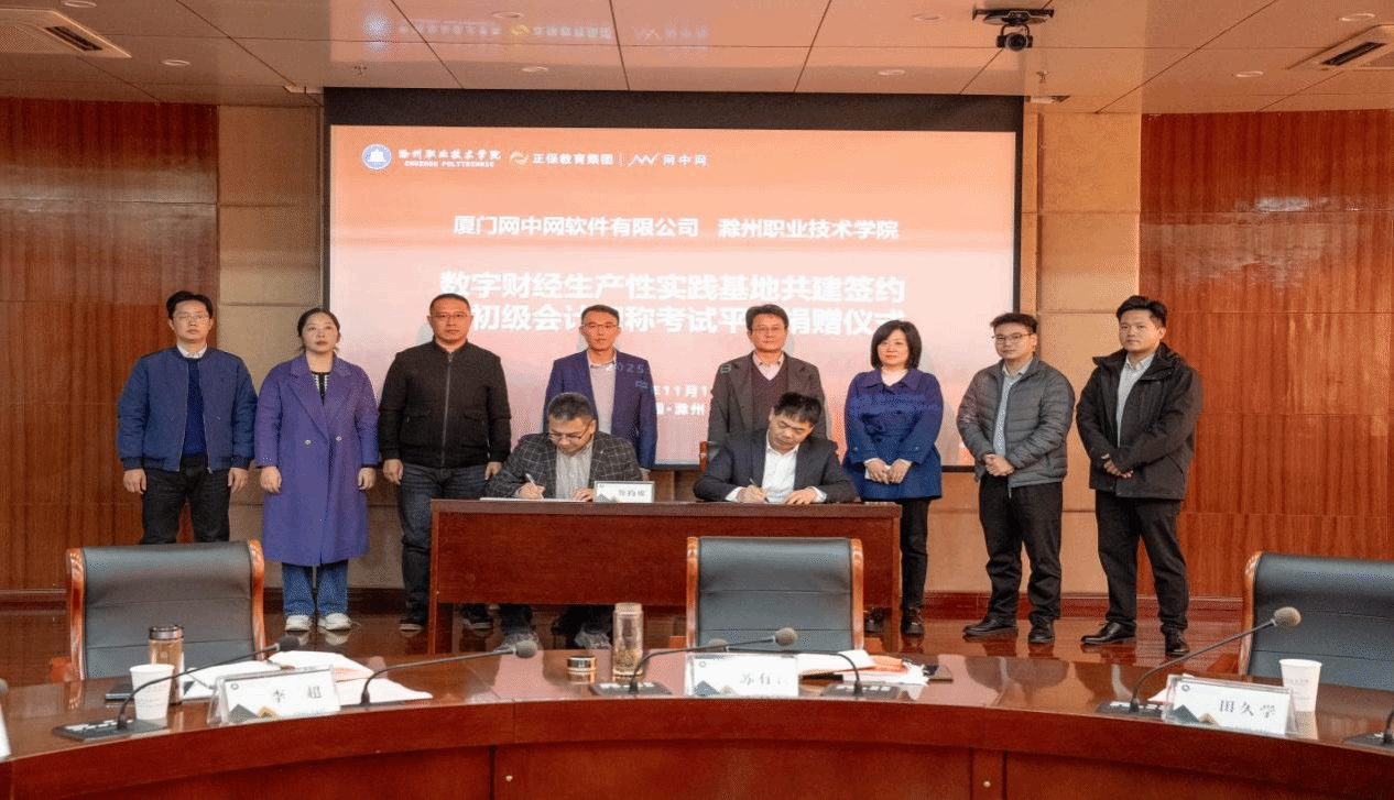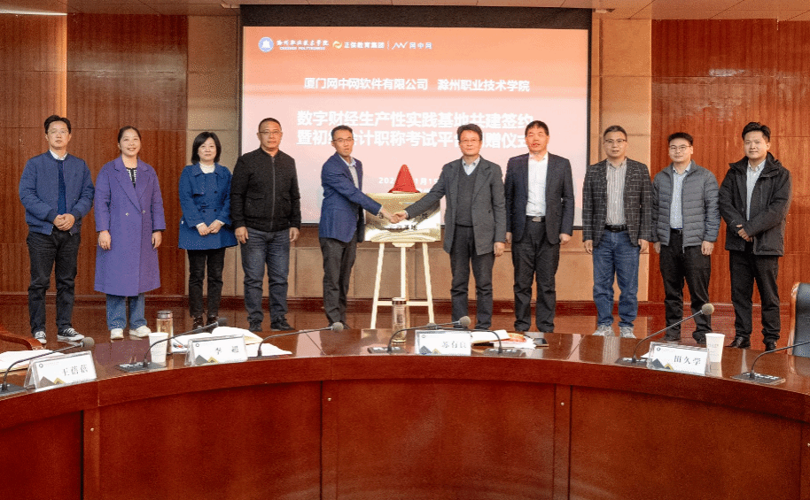 11月19日,雷竞技raybat竞猜管理学院与厦门网中网软件有限公司联合举行“数字财经生产性实践基地”共建签约暨初级会计职称考试平台捐赠仪式。校党委委员、副校长苏有良出席活动并致辞,校党委委员、商学院党总支书记李超、计划财务处处长王蓓蓓、校企合作办公室主任周多道、管理学院党总支书记何文婧、管理学院副院长颜洲,厦门网中网软件有限公司副总裁田久学、院校事业部总经理李邦勇、安徽省区域经理刘家乐、实施经理余智洋及管理学院师生代表参会。