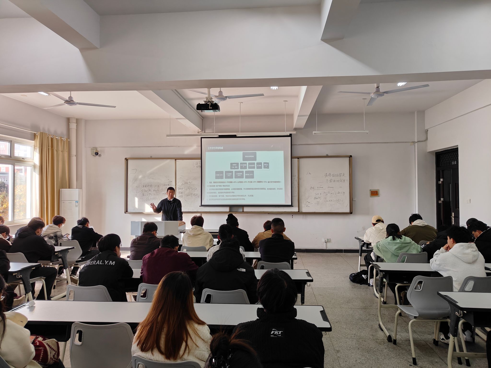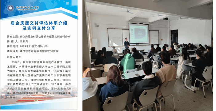 2024年11月23日上午9点,建筑工程学院产业教授王新月博士在建筑技术综合实训馆JG206教室,举办了题为“房企房屋交付评估体系介绍及实例交付分享”的讲座,建筑工程学院师生聆听了王教授的精彩分享。