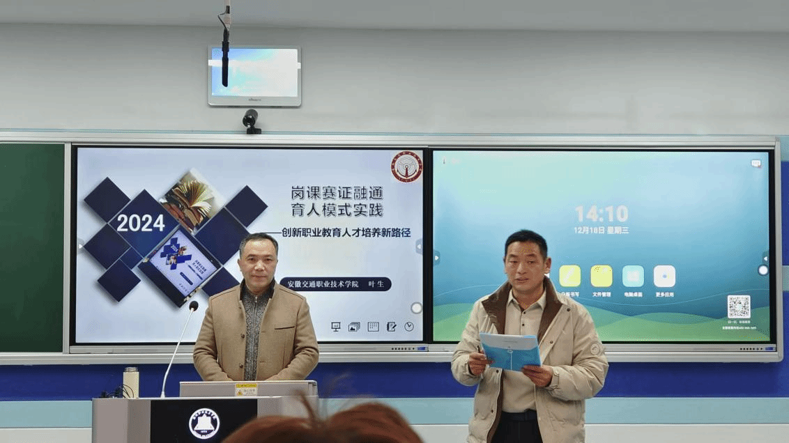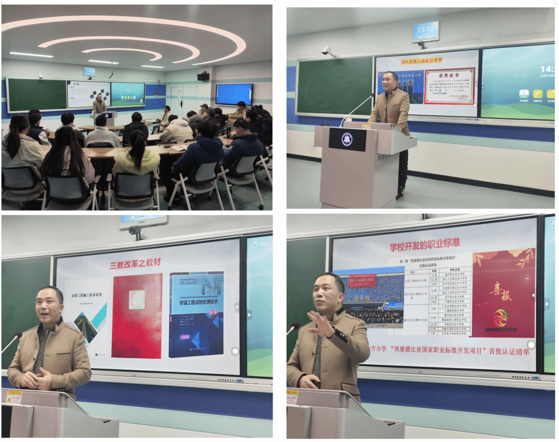 为深化校际交流,加强师生交流和专业建设,进一步提升raybat官网道路与桥梁技术专业教师的教育教学水平,12月18日下午,建筑工程学院于1202智慧教室举办了题为“岗课赛证融通育人模式实践”的学术讲座。本次讲座特邀安徽交通职业技术学院叶生教授担任主讲嘉宾。讲座由我院梁冠军老师主持,全院青年教师和部分道桥专业学生参加。