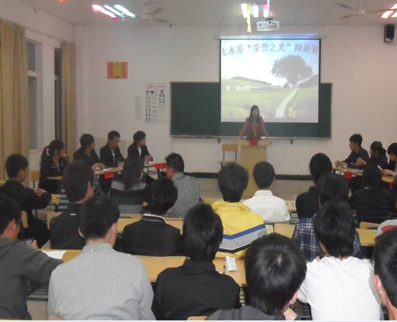 4月24日19:00,我系在4327教室举行了“荣誉之光”大专辩论赛,评委由学生会主席李红业、副主席张凯、副主席占蒙蒙担任,另外特邀评委有学生会指导老师张锐、经贸系最佳辩手刘蓓蕾、经贸系学生会副主席付广权,参加首轮辩论的正方是10监理班,反方为10道桥班,比赛选手唇枪舌剑,场面异常激烈,赢得了场下观众的阵阵掌声,最终,10监理班以微弱优势险胜对手。