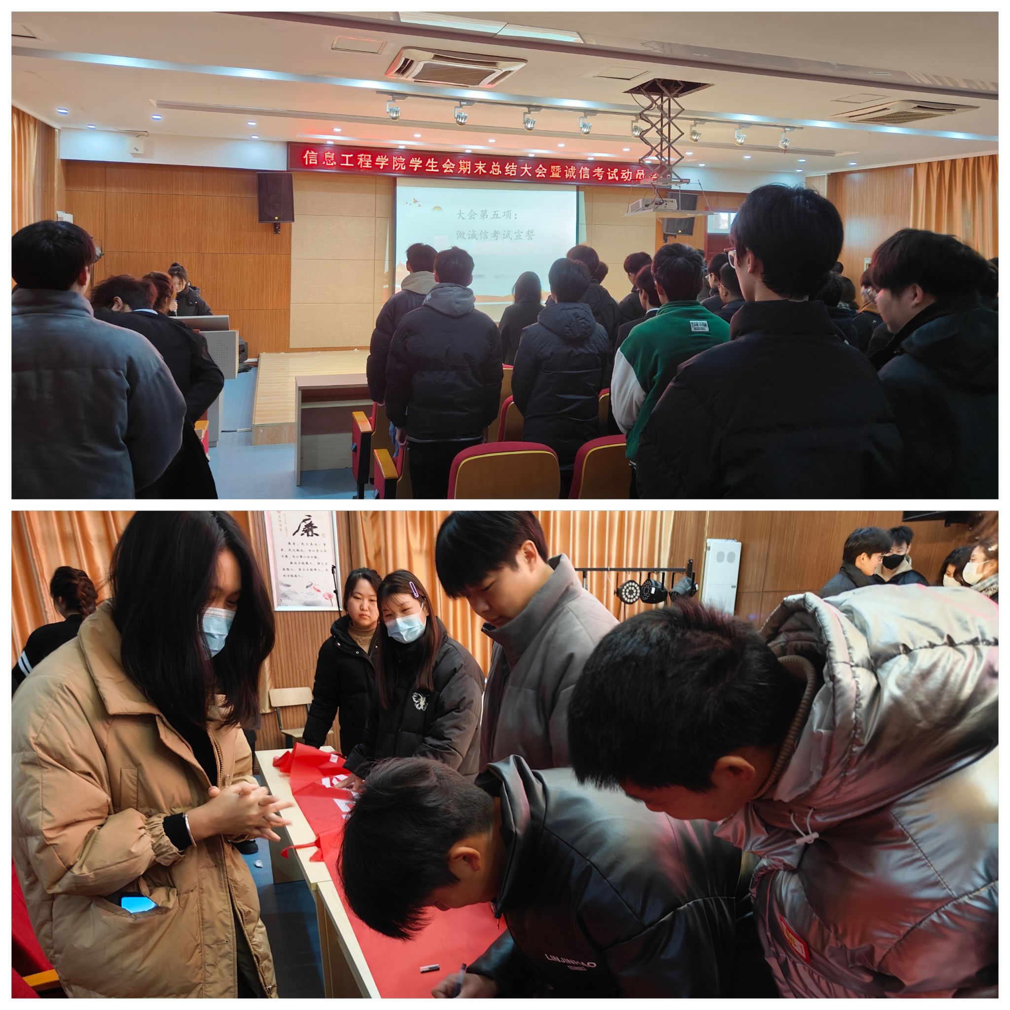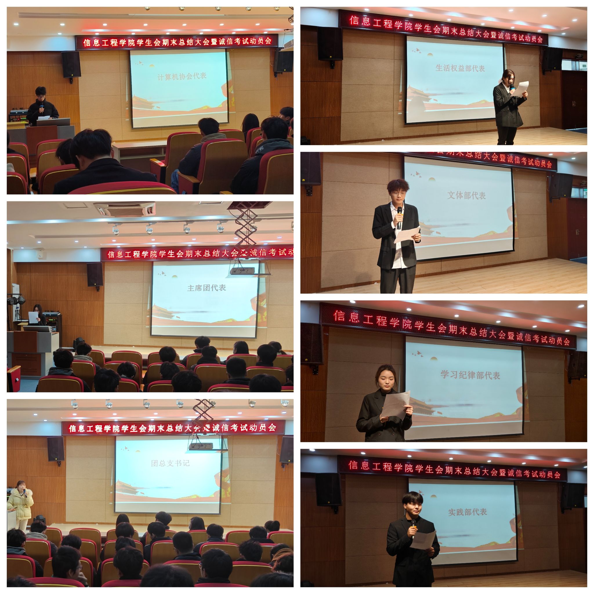 为全面检验和总结2023-2024学年第一学期我院学生会的工作成效,促进学生组织的持续发展,同时增强组织成员的诚信考试意识。1月3日下午,信息工程学院学生会于南阶203开展了期末总结大会暨诚信考试动员会。院团总支书记朱睿、计算机协会指导老师薛玉姣、学生会全体成员、计算机协会代表参加此次会议。