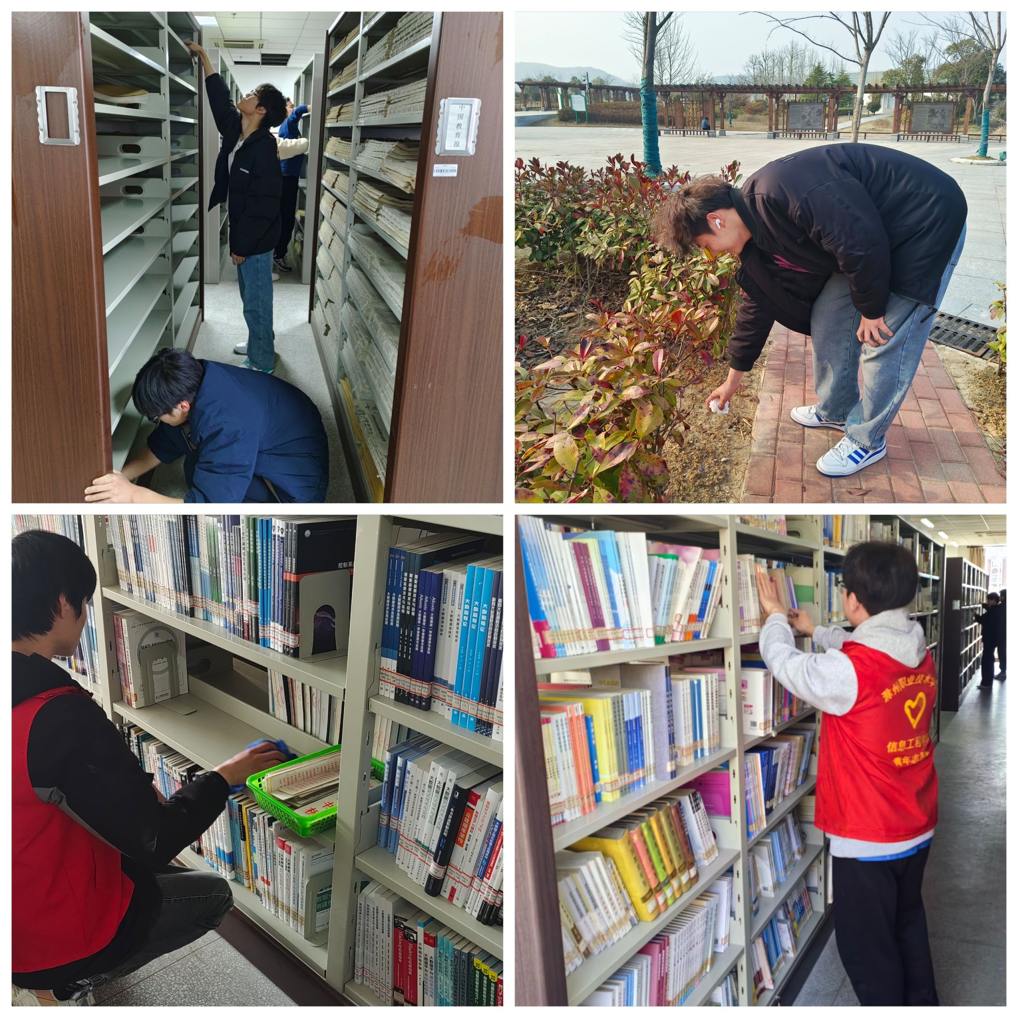 二是践行雷锋精神主题志愿服务活动。各支部积极响应践行雷锋精神,开展了校内外志愿服务活动。23物联网等团支部以劳动课为契机,组织学生志愿者开展图书馆和校园卫生清扫活动,同学们分工合作,协助图书馆工作人员整理书籍、清洁卫生、帮助读者查找书籍,让图书馆、教室等环境焕然一新,获得了老师们的一致好评。同时,23计应2班等团支部组织前往琅琊山和境园公园开展清理垃圾等环保志愿服务活动,用实际行动践行雷锋精神,为保护环境贡献自己的力量。