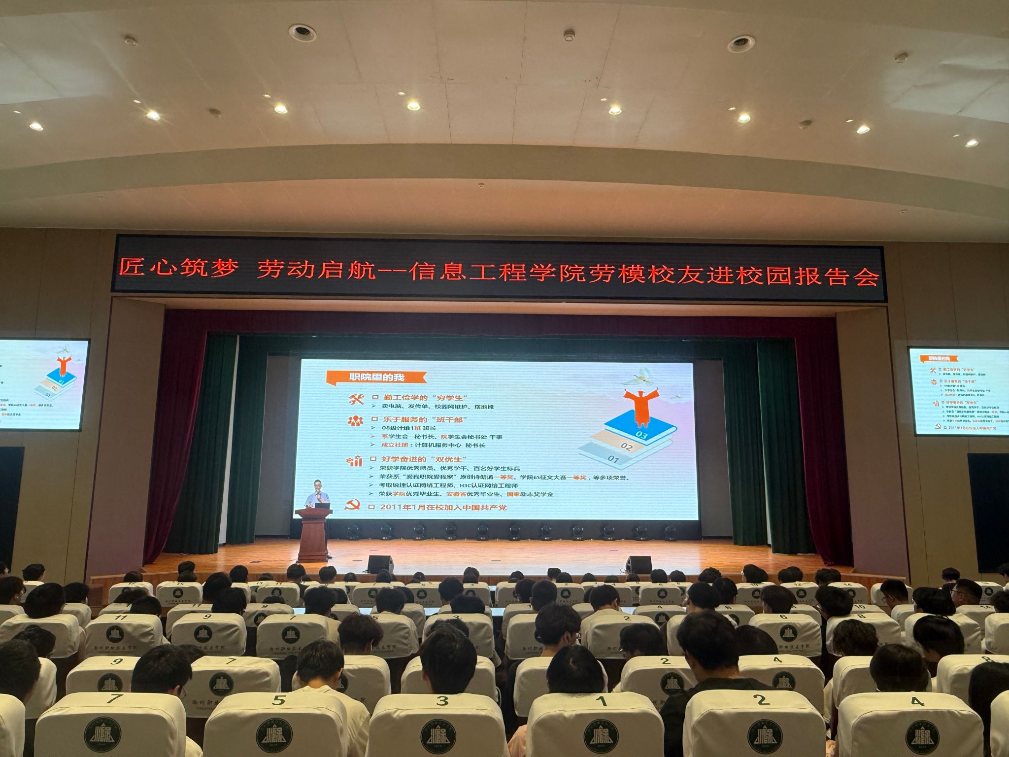 5月21日下午,信息工程学院在6号楼报告厅开展了以“匠心筑梦,劳动启航”为主题的劳模校友报告会,邀请2011届安徽省优秀毕业生、中通服网盈科技有限公司工程管理部高级主管张友全校友返校分享职业成长经验。学生工作处副处长朱亚春出席并致辞,学院百余名师生参与活动。