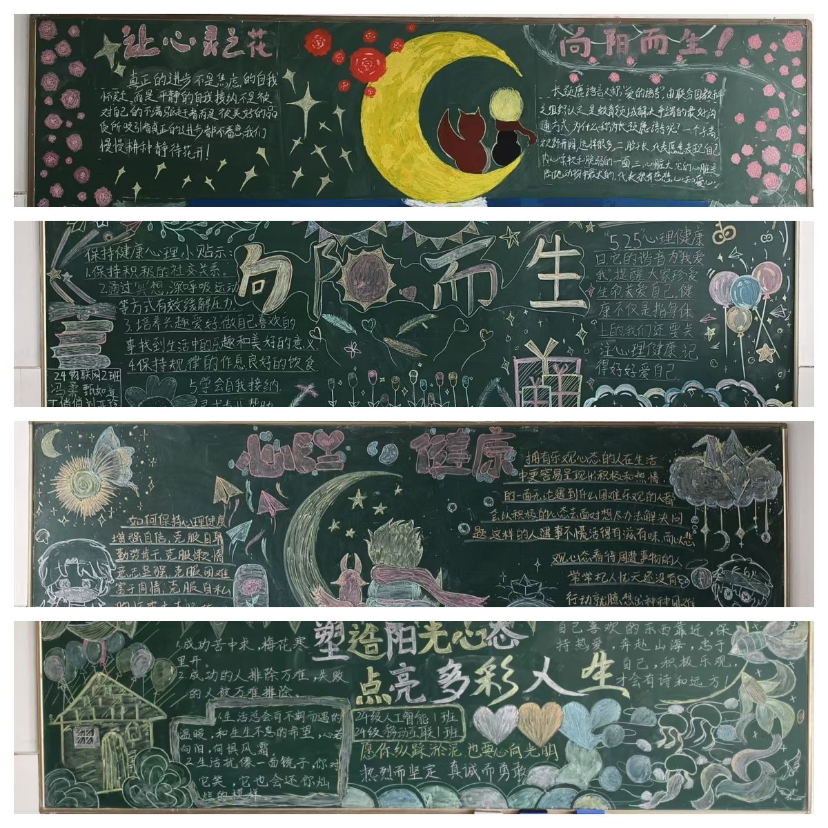 为积极响应校园心理健康教育号召,充分发挥艺术在心理育人中的独特作用,在“5.25”心理健康教育宣传月期间,信息工程学院精心组织开展“心语绘心,青春同行”主题黑板报绘制活动。同学们用创意与画笔搭建心灵沟通桥梁,营造出温暖向上的校园心理健康氛围。