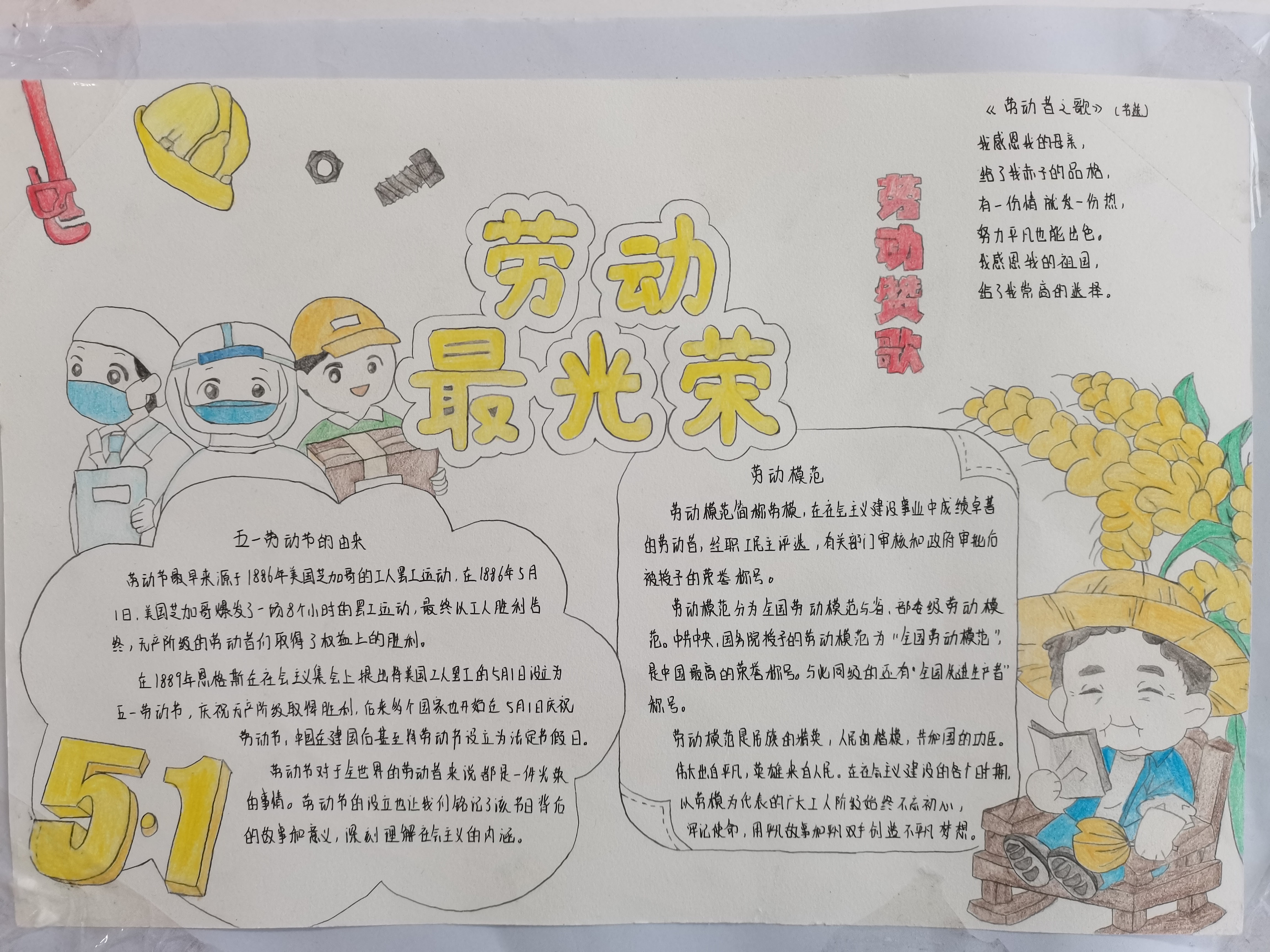 为庆祝“五一”国际劳动节,丰富同学们的校园文化生活,培养学生的动手能力,陶冶审美情操,牢固树立劳动意识。5月1日,信息工程学院团总支开展了劳动最光荣手抄报评选活动。