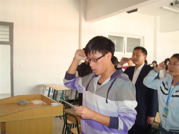 大会在嘹亮的团歌声中拉开帷幕,程书记也同全体团干们一起在鲜红的团旗下举起右拳重温入团誓词。