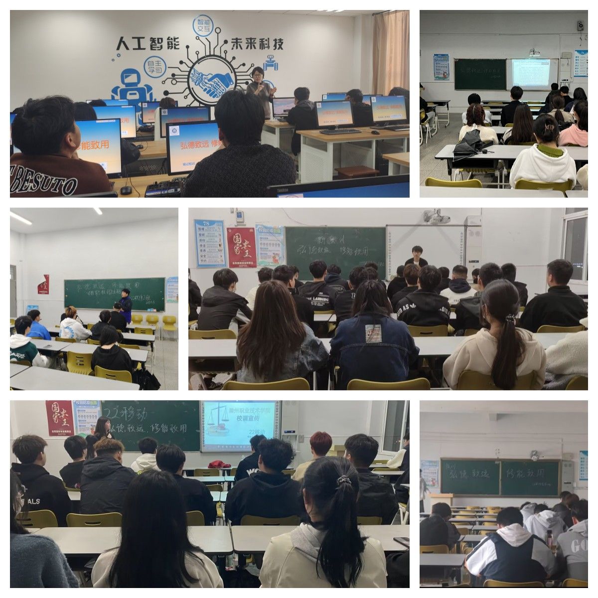 我院各班级通过各种形式向学生进行校训宣传,形式包括主题班会、微信、班级QQ群等。通过各种校训宣传活动,我院学生对校训内涵有更清楚的了解与认识。在今后的校园生活中,他们将依据校训内涵规范行为,依据校训内涵导向个人价值观建立,从而推动校园文明建设。