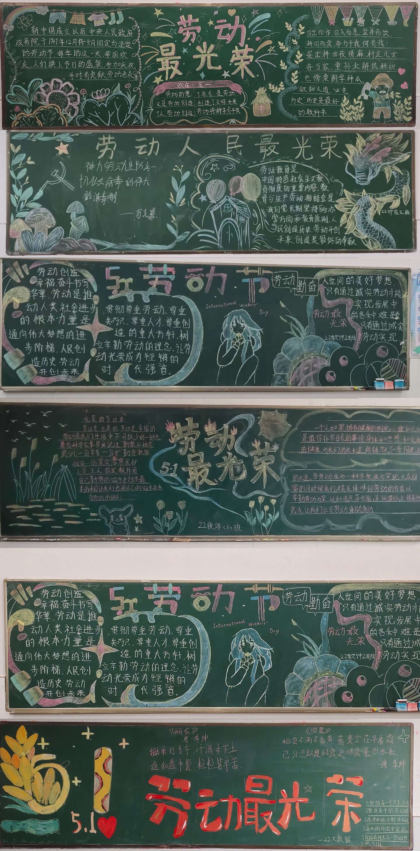 在思想宣传方面,各班级积极响应学院号召开展劳动理论宣传。各班级紧扣“劳动铸就新征程”主题,开展“劳动+思政”主题班会,让学生了解活动主题、活动意义,知道活动目的,鼓励学生发扬劳动精神,让自觉劳动成为每个人的良好习惯。同时,各班级积极响应院学生会安排参加“劳动最光荣”主题黑板报评比活动。