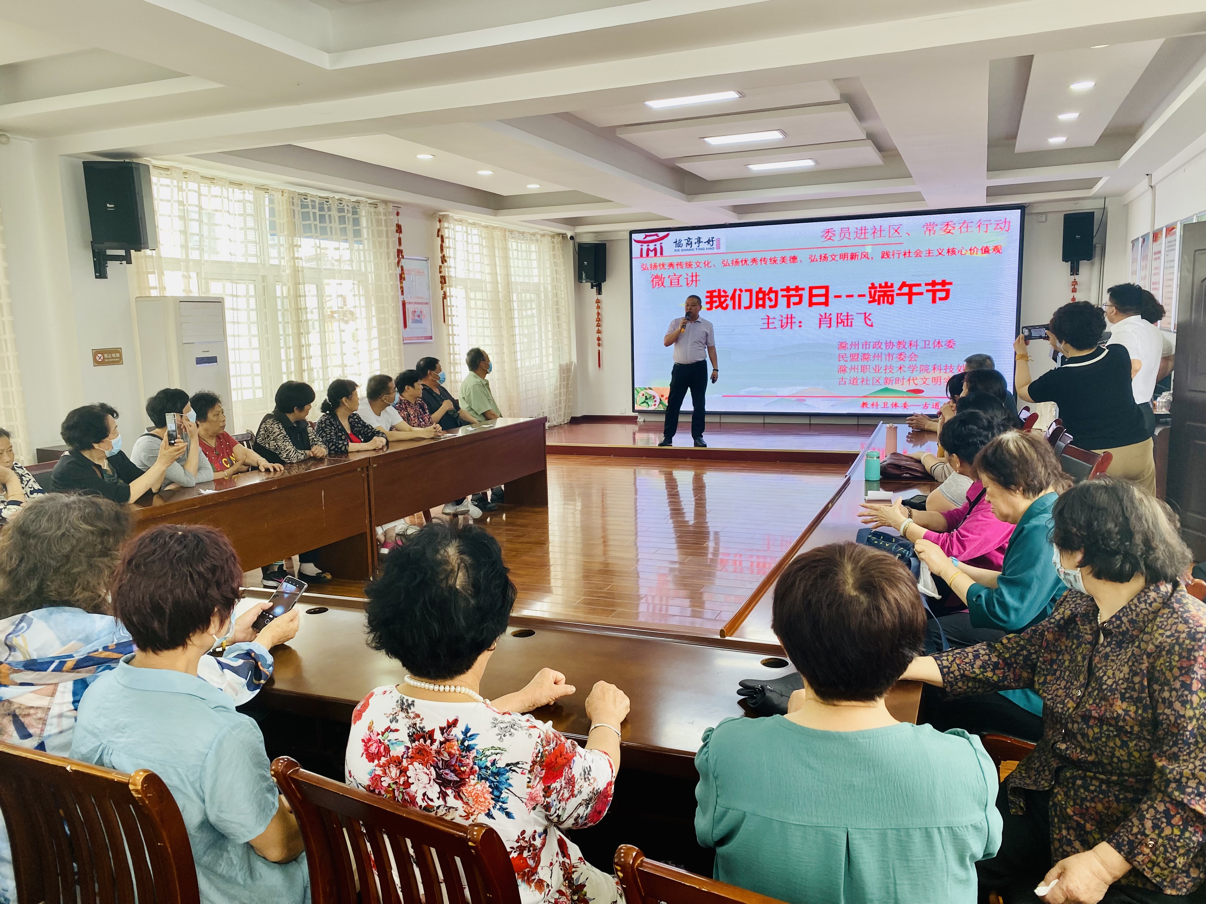 5月31日上午,应滁州市政协教科卫体委邀请,科技处赴琅琊区琅琊街道古道社区,以“弘扬优秀传统文化”为主题开展“我们的节日——端午节”宣讲活动,活动由市政协教科卫体委主任范新玉主持并讲话。教科卫体委专职副主任鲁梅等市政协小组委员、社区工作人员、社区志愿者和部分社区居民参加活动,宣讲活动由科技处肖陆飞主讲。肖陆飞从关于端午节的传说谈起,介绍了端午节的起源、各地主要习俗和现实意义,并在宣讲最后,围绕“端午节”开展了有奖竞答活动。宣讲以传统节日为契机,通过弘扬优秀传统文化、弘扬优良传统美德、弘扬文明新风,践行社会主义核心价值观。本次活动也得到了食品与环境工程学院党总支和校团委的大力支持。