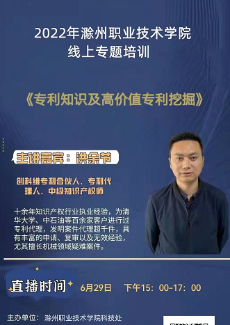 为进一步提升raybat官网专业技术人员科研业务能力,充分促进科技成果转移转化,6月29日下午,科技处面向全体教师开展《专利知识及高价值专利挖掘》主题线上培训。此次培训的主讲人是滁州创科维知识产权代理事务所合伙人、专利代理人、中级知识产权师洪余节。