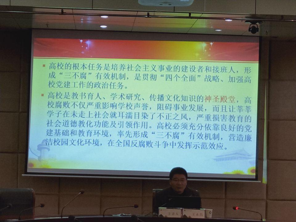 为贯彻一体推进“三不”机制建设要求,进一步营造廉洁校园文化环境,1月13日上午在11楼会议室,校纪检监察室邀请市纪委监委第九纪检监察室主任王永昌开展专题培训,学校各党总支、直属党支部书记和纪检委员,各教学院部、部门主要负责同志参加培训。