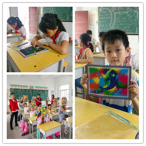 由于汪郢小学没有专业的音乐、美术、舞蹈老师,这里的孩子们渴望学习这些兴趣课。因此,志愿服务队的同学们在班主任李老师的组织下,来到了汪郢小学三年级1班,为这里的留守儿童带来了彩画及手工制作材料,给孩子们带来了一场精彩的兴趣课。