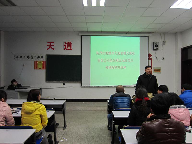 2012年12月17日下午14:20在5113教室,艾迪亚模具制造有限公司总经理张远红应邀来我系,为11级模具专业的同学们举行了一场关于“塑料模具设计的方法与技巧”的讲座。汽车工程系张信群教授、辅导员茆怡娟以及生化系的部分老师和高分子材料专业的同学也参加了此次讲座。