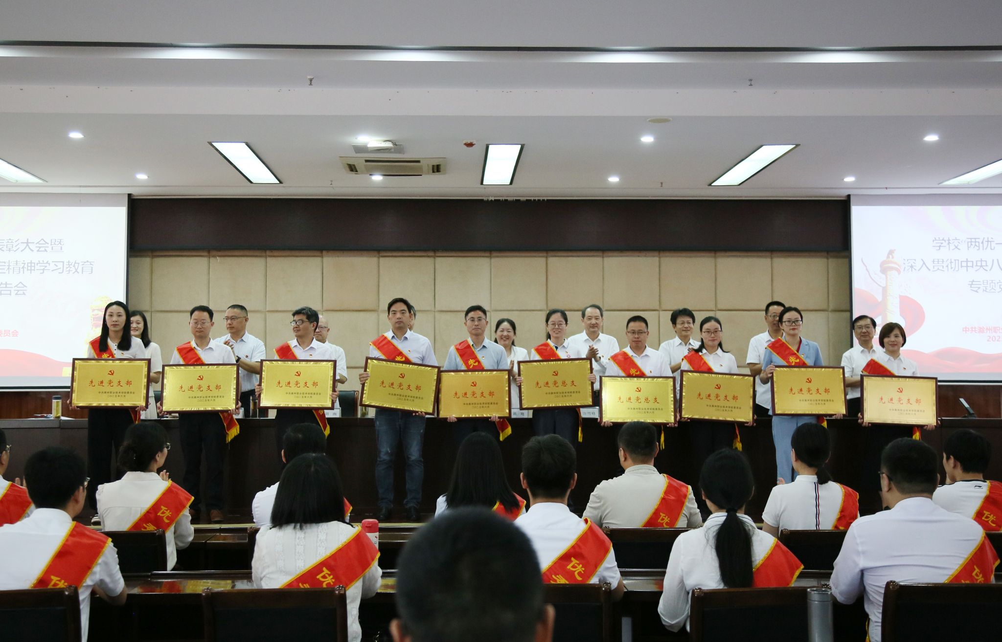 为庆祝中国共产党成立104周年,推动深入贯彻中央八项规定精神学习教育走深走实,发挥先进典型示范引领作用。7月1日,学校党委在综合楼5楼报告厅举办“两优一先”表彰大会暨深入贯彻中央八项规定精神学习教育专题党课报告会。党委书记陈飏出席会议并讲授专题党课。校领导班子成员出席会议,各教学院部、各部门正副职,各党支部书记、“两优一先”获奖人员参加会议。党委副书记、校长许雪峰主持会议。