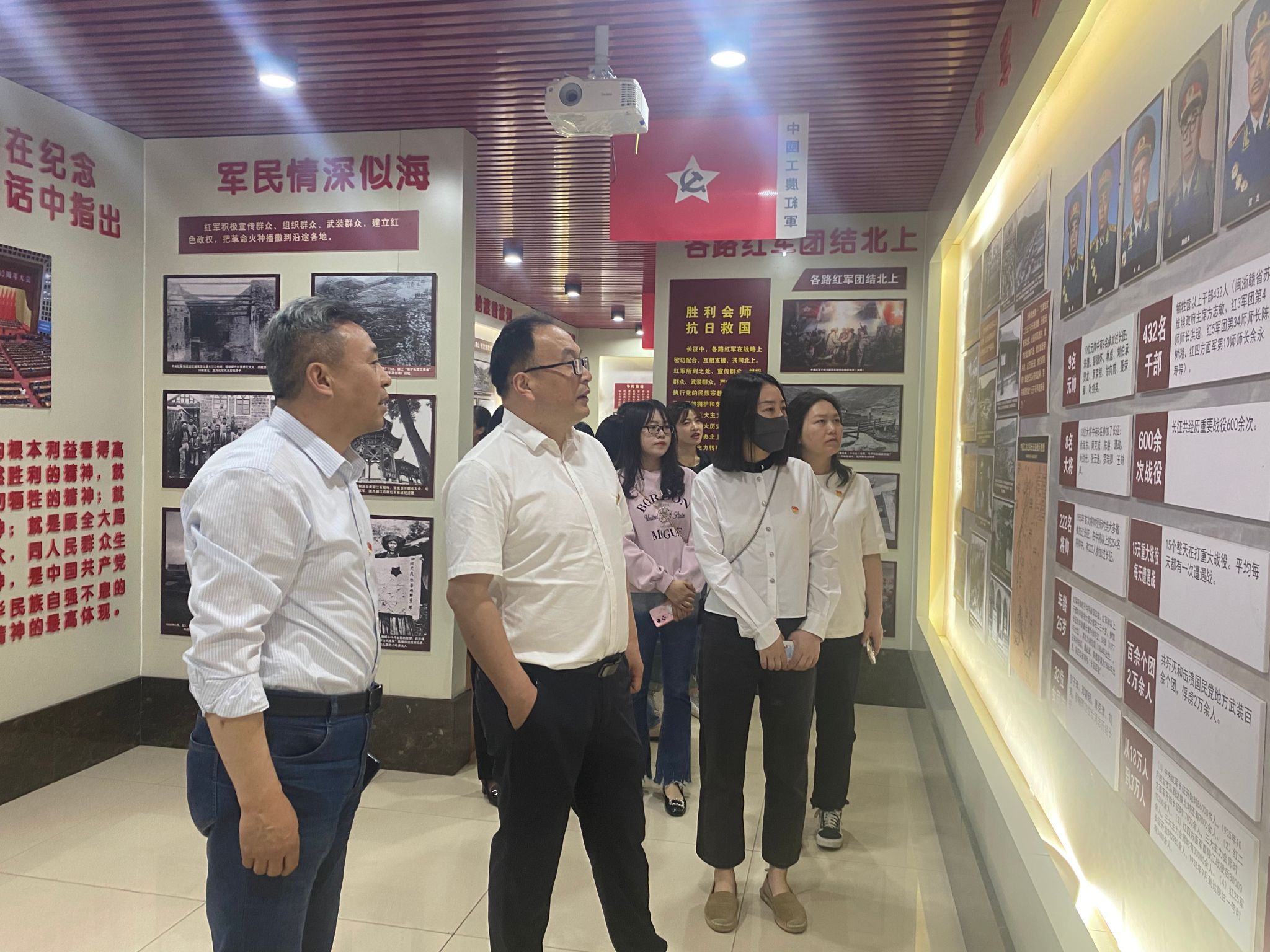 在琅琊区凤凰湖社区长征精神主题教育馆内,传媒与设计学院学生管理党支部党员凝神驻足,仔细观看了馆内历史图片,重温血战湘江、四渡赤水、巧渡金沙江、飞夺泸定桥等充满血与火的战役,在身临其境的党史学习之旅中缅怀革命先烈,领悟长征精神。