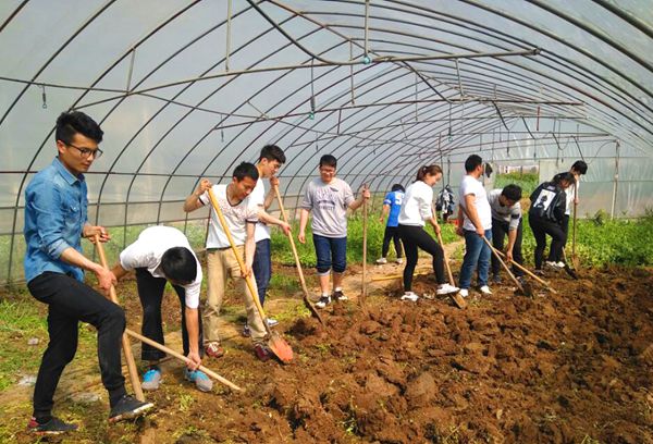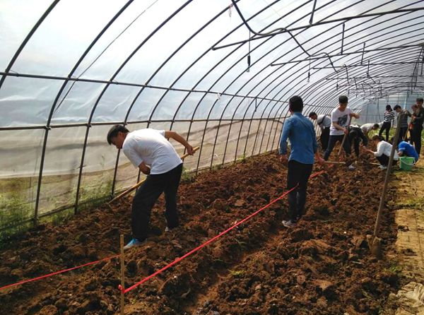 实习第一天的主要任务是整地做畦。施基肥、深翻、做畦、覆膜,每一个步骤同学们都干的热火朝天。实习第二天的任务是定植。定植的蔬菜苗是前期学生实训课育出的番茄苗、黄瓜苗、黄秋葵苗和豇豆苗等。挖定植穴、摆坨、浇水、掩埋,大家分工合作,干的又快又好。实习第三天的任务是去石马蔬菜基地参观学习。在田间地头,同学们观察记录、跟有经验的菜农交流,了解了该基地种植的蔬菜种类、蔬菜的茬口安排、老菜园土壤的改良技术等。
