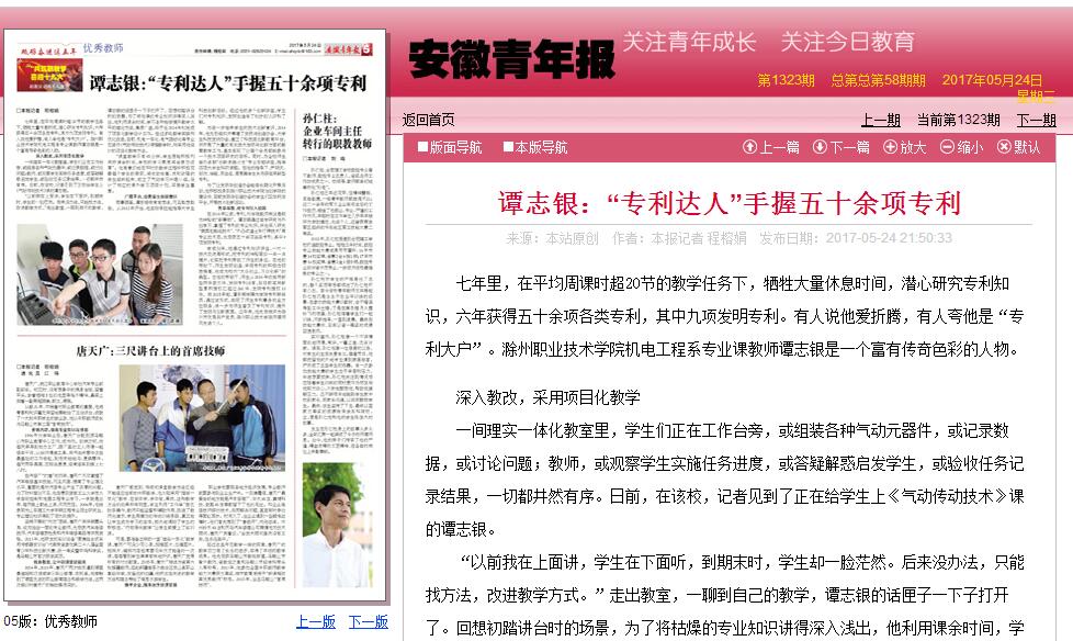 学成归来,他通过专利知识讲座、一对一技术交流等形式,把专利的神秘面纱一点一点揭开,切实把专利带到了师生的身边。在他的带动下,师生发明创造、申报专利的积极性明显提高,他成为校内“大众创业,万众创新”的典型。在他的带动下,师生从2010年的实用新型两件至三件、发明专利没有,到目前实用新型累积授权已超过260件、发明专利授权10件。自2015年起,谭志银被聘为学院专利联络员,通过该形式,实现了师生专利事务的全方位服务,进一步为师生普及了专利知识,提升了发明与创新氛围。近年来,他先后被评为滁州市优秀共产党员、雷竞技raybat竞猜师德师风先进个人。